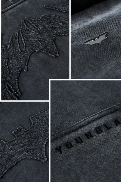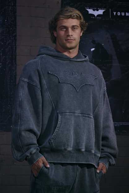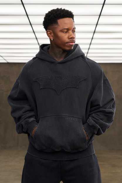 DESIGN: This hoodie features a washed finish with a raised tonal bat emblem across the chest for a bold but minimal look. Broad seam work adds shape and structure throughout, giving it a slightly rugged feel. The relaxed fit, dropped shoulders, and deep kangaroo pocket make it an easy everyday staple with character.