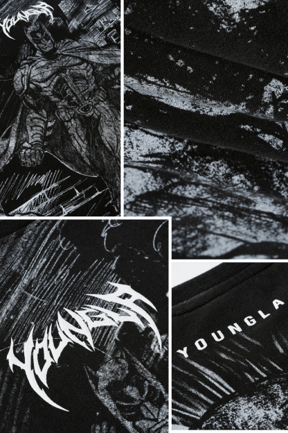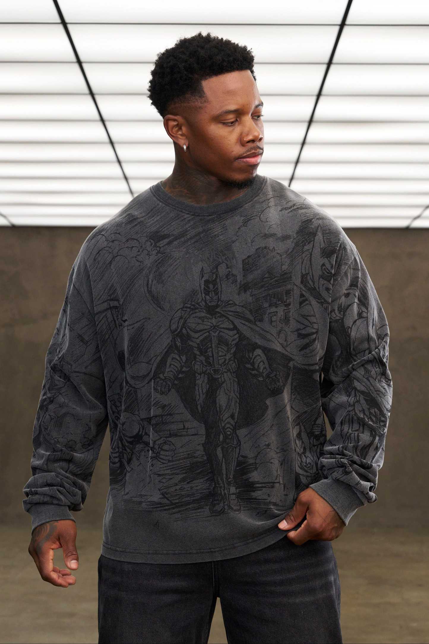 DESIGN: This crewneck features full-body comic artwork of Batman, wrapping across the front, sleeves, and back for an all-around illustrated look. The washed charcoal base softens the lines, giving the graphics a hand-drawn feel with depth and texture. Finished in a loose silhouette, it wears relaxed while still delivering a strong visual statement.