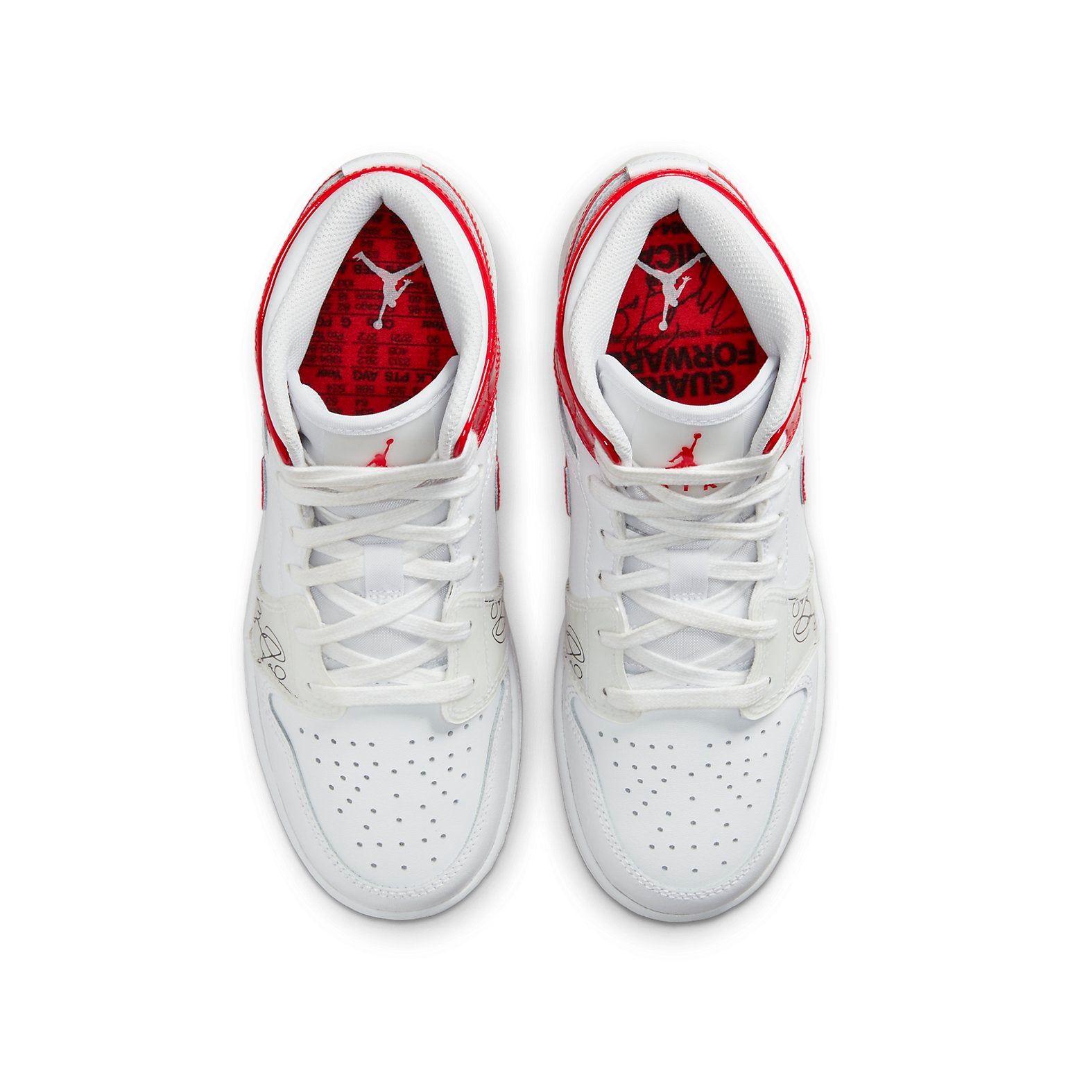 The Air Jordan 1 Mid 'Rookie Season' is a stylish sneaker for kids, featuring a simple white leather upper with glossy red overlays on the ankle collar and Swoosh logo. The forefoot features a rainbow-colored wing pattern. The sneaker also has several layers of semi-transparent TPU overlays on the forefoot, heel, and tongue, each with a unique design. On the forefoot, you'll notice Michael Jordan's John Hancock signature, while the heel details Michael's draft night stats and his selection of the Chicago Bulls. This sneaker is perfect for everyday wear and is ideal for any basketball fan.
