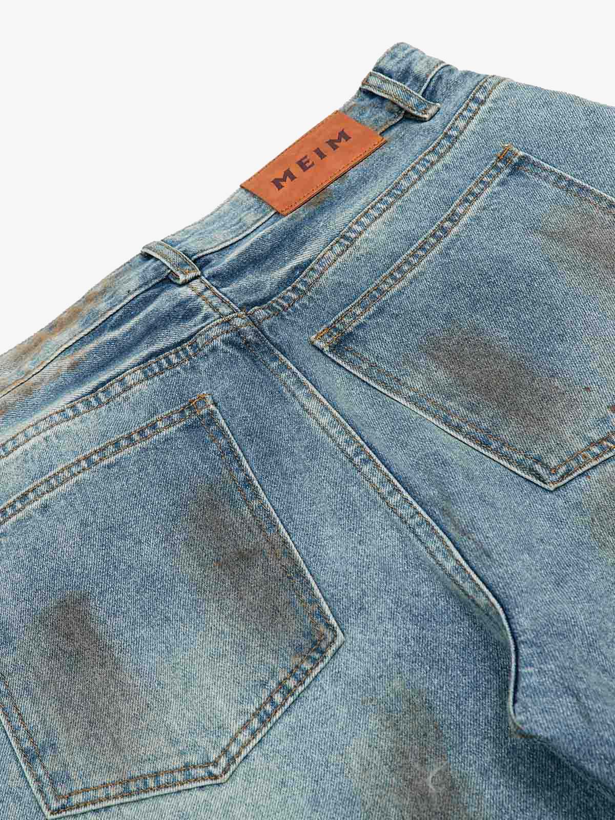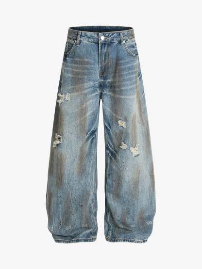 ? Design Elements: Distressed details, wide-leg cut, high-rise waist