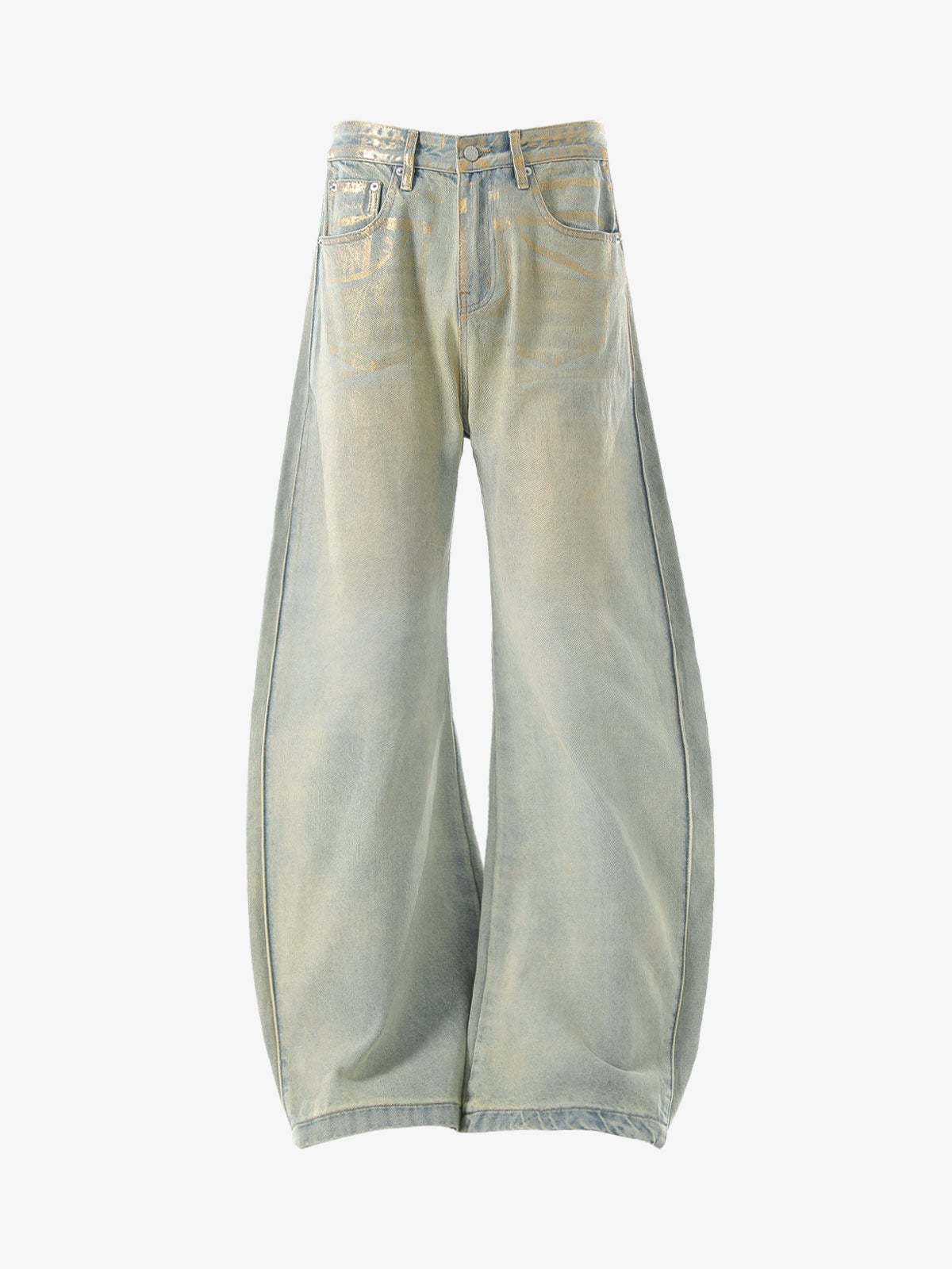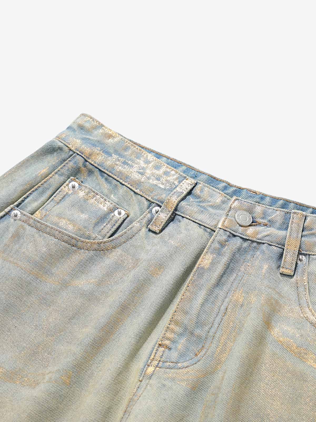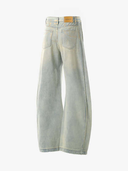 ? Design Elements: Distressed details, wide-leg silhouette, classic five-pocket design