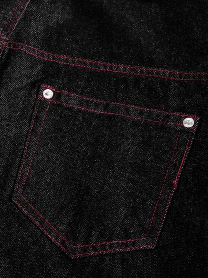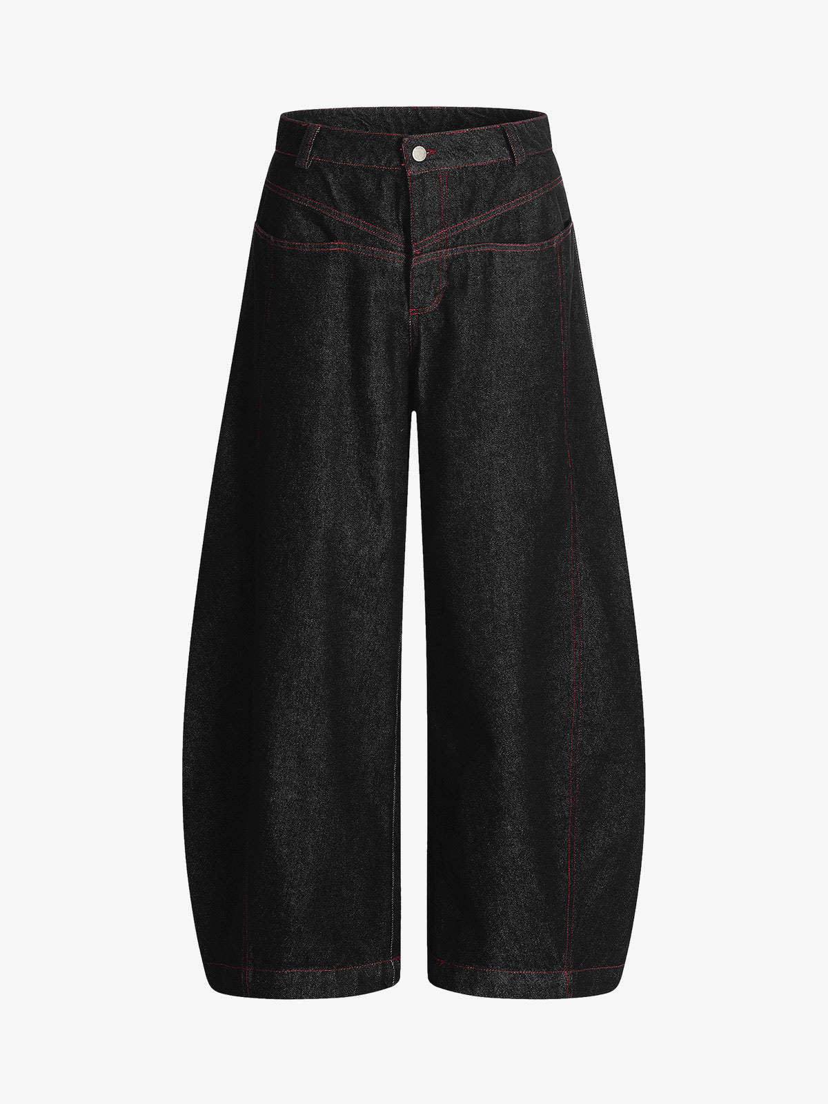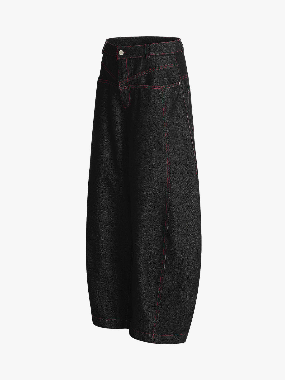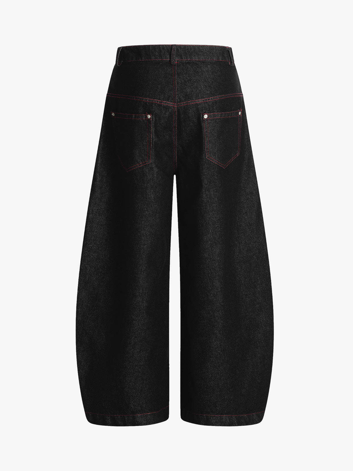 ? Design Elements: High-rise waist, wide-leg silhouette, red contrast stitching
