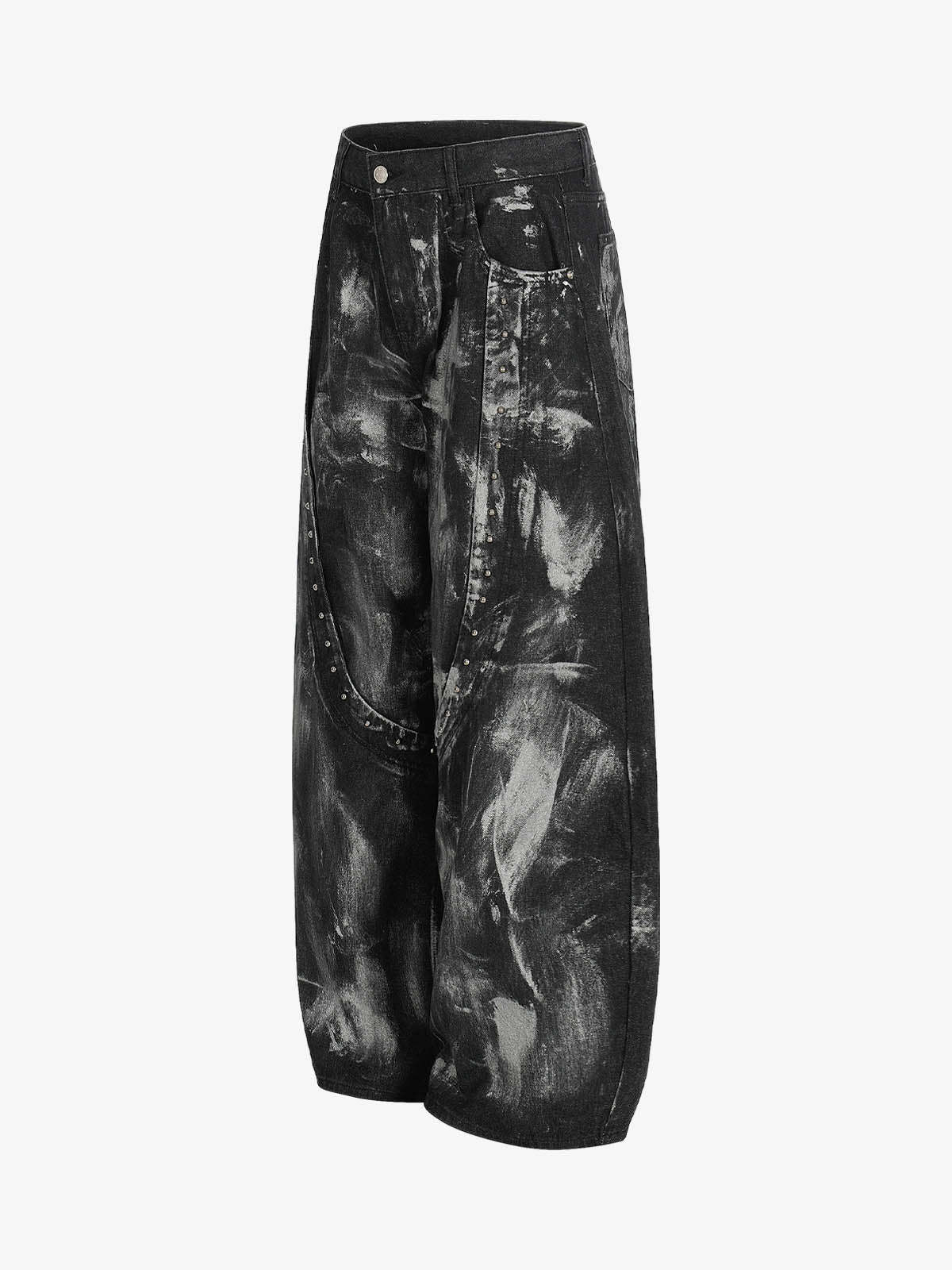 ? Design Elements: Tie-dye pattern, wide-leg silhouette, decorative studs along the sides