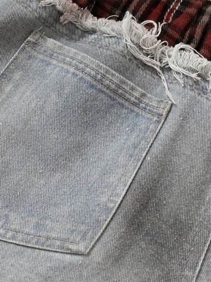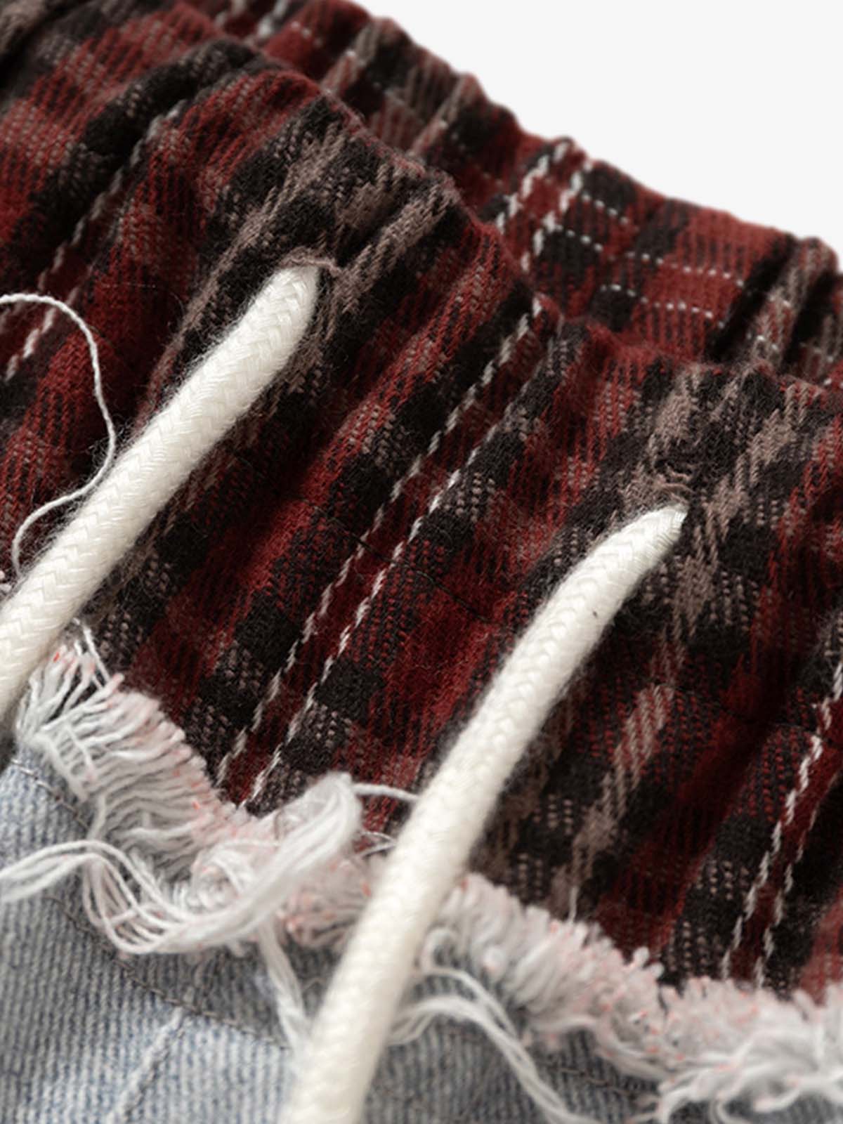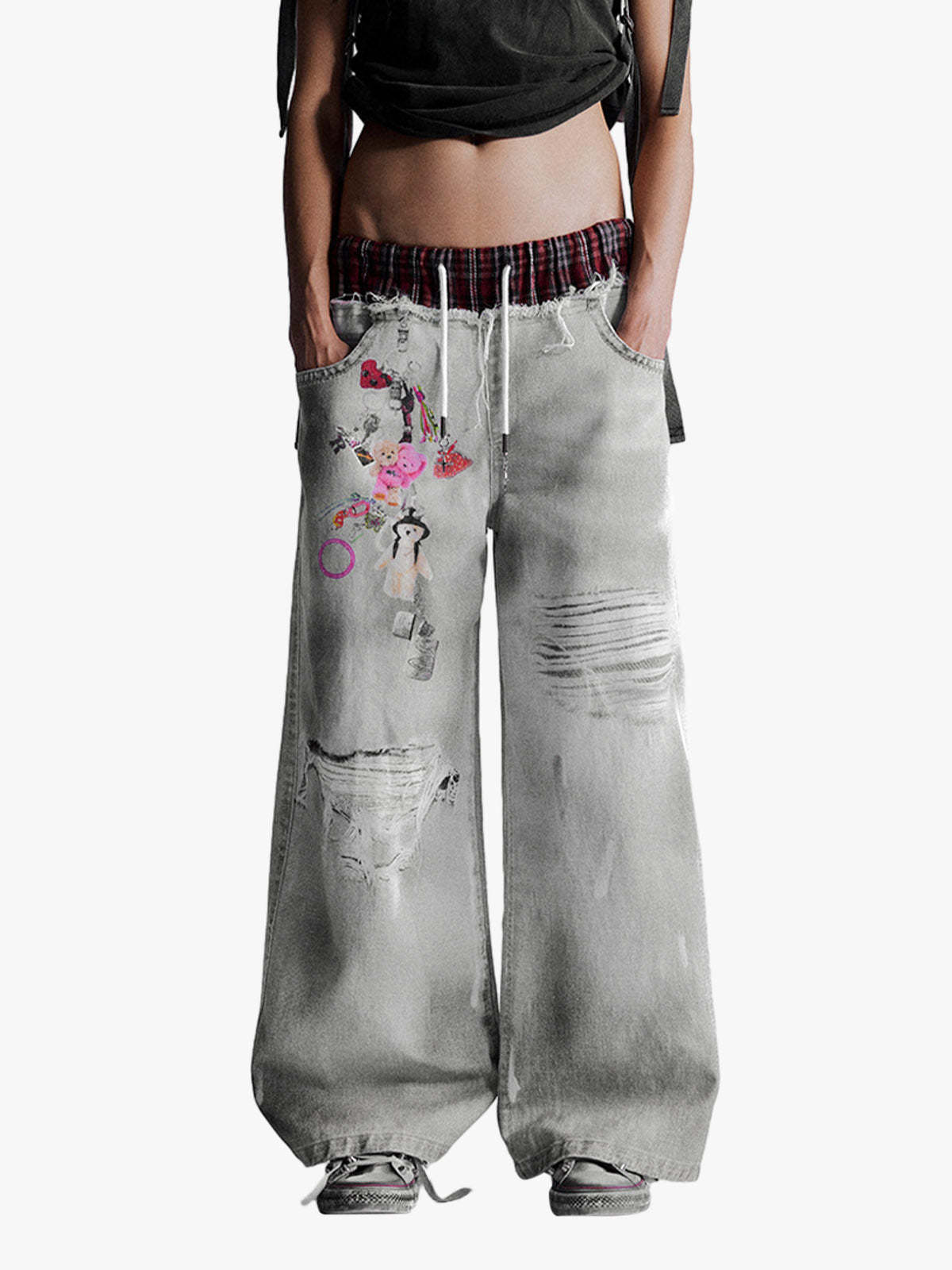 ? Design Elements: Plaid waistband, graphic print, distressed details